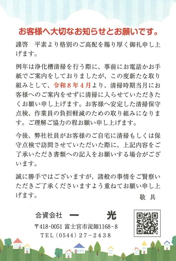 この度弊社では、令和8年4月より浄化槽清掃のご案内の際に、ご連絡不要での書面記入をお願いする運びとなりました。